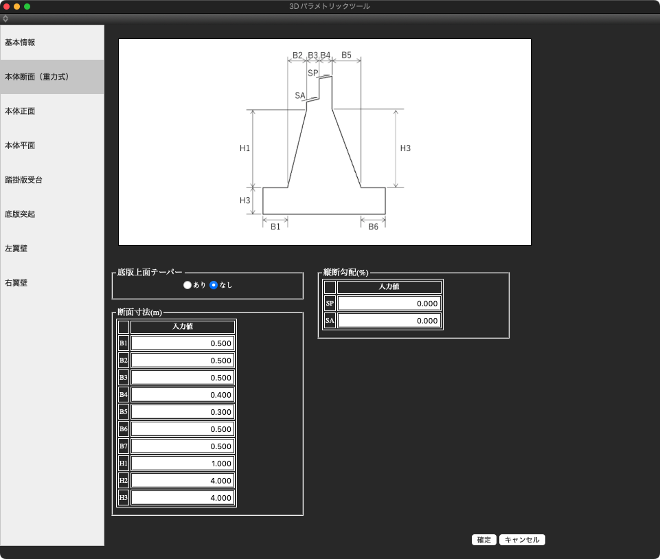 「3Dパラメトリックツール」ウインドウ(橋台 本体断面(重力式))