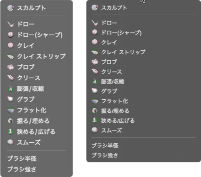 メインメニューの「スカルプト」、「ツールボックス」の「スカルプト」から表示されるポップアップメニューです。