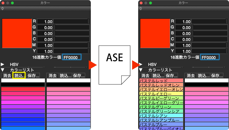 注意Adobe製品と同じ色で表示するには、Adobe製品のカラーモードをRGB形式にした状態で書き出したASE形式ファイルを読み込んでください。他の形式だと色が一致しないことがあります。