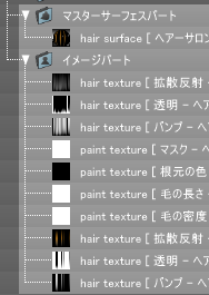 - 「Hair」パートを選択した状態で、「表面材質」ウインドウを表示します。先ほど設定したヘアテクスチャが反映されていることが確認できます。