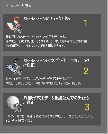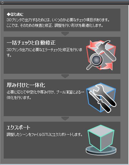 「一括チェックと自動修正」からシーンのチェックを行い、修正の終わったシーンに対して「厚み付け」や「一体化」を行い、「エクスポート」でSTLに出力するのがもっとも単純な流れとなります。
