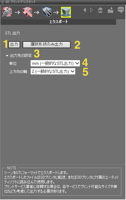 - 4: 出力する単位を「mm(一般的なSTL出力)」「cm(mayaなど)」「inch(3ds maxなど)」から選択します。
