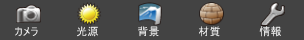 統合パレットの表示内容を切り換えることができます。ボタンは左側から、「カメラ」「無限遠光源」「背景」「表面材質」「形状情報」の各コントロールウインドウに対応しています。また、この切り替えボタンをダブルクリックすることで、各コントロールウインドウの分離/統合を行うことができます。