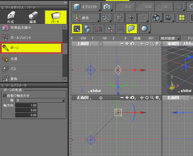 この状態で図形ウインドウ上をドラッグすると、ボーンが生成されます。