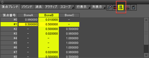 - 頂点ブレンド方式では、各頂点のウエイトの和が1である必要があるため、正規化ボタンがオンであることを確認しておきます。