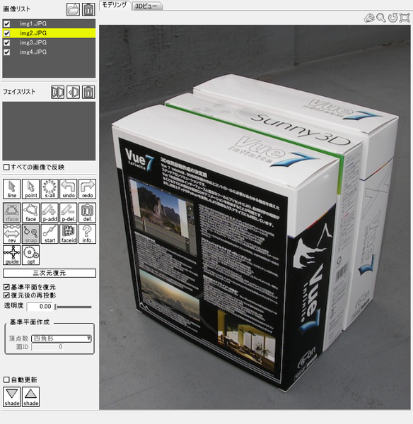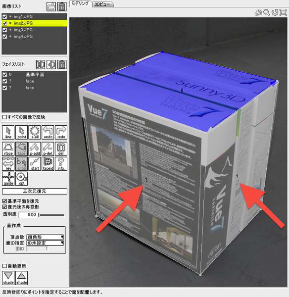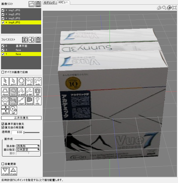 「基準平面」はすべての画像に存在する面で、現実世界での正方形、あるいは長方形である必要があります。フォトモデラーを起動すると「rface」ツールが選択されてます。このツールが選択された状態で、右のプレビューエリアで左回りに4点をクリックして基準平面を配置します。クリックする最初の位置は、すべての基準平面で同じ位置でなければなりません。ここでは上部の面を基準平面とし、最初のクリック位置は「Vue 7」の「7」の文字の上としました。