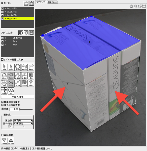 「face」ツールが選択された状態で、右のプレビューエリアを左回りにクリックして面を配置します。初期値では頂点数が4に設定されていますので、4回クリックすると面が配置されます。配置された面には「?」が表示され、IDが未設定であることを示しています。基準平面の配置と同様、最初のクリック位置は面ごとに同じ位置でなければなりません。