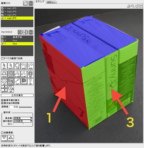 IDはすべての画像で共通でなくてはなりません。たとえば、現実世界で正面となる面を「1」とした場合は、正面が撮影されているすべての画像で、正面に配置された面のIDを必ず「1」に設定します。作例では、正面のIDを「1」名称を「front」、右側を「2」名称を「right」、左側を「3」名称を「left」、後ろ側を「4」名称を「rear」としました。IDの設定は、複数の画像で統一させなくてはならないので、あらかじめメモなどに書いてから設定すると良いでしょう。