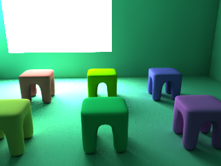 大域照明(パストレーシング / フォトンマップ / ラジオシティ)のパスを生成します。パストレーシング、フォトンマップでは間接光、IBL、コースティクスの成分のみ、ラジオシティでは「エネルギー」ポップアップメニューで選択した成分が含まれます。すべての形状の表面材質を削除したレンダリング結果から、無限遠光源、形状光源による直接光成分を除いた結果と同じイメージとなります。