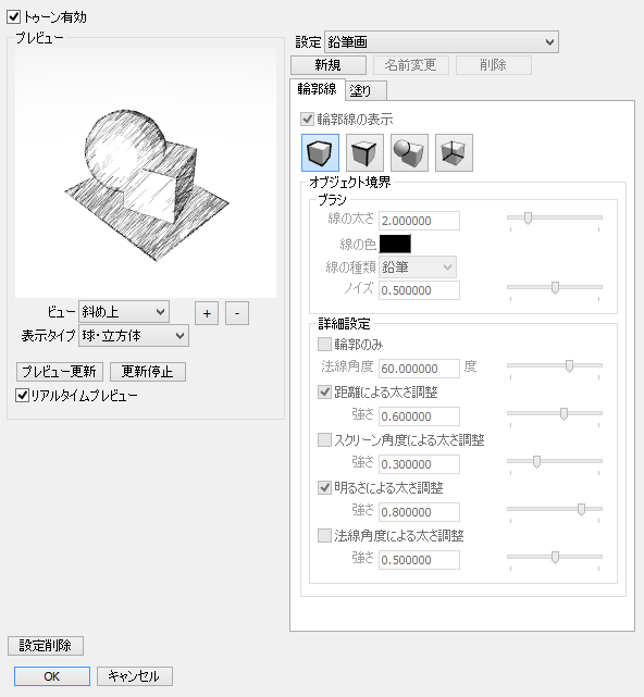 そのほかにも「テクニカルイラスト」、「鉛筆画」など、あらかじめ設定されたプリセットから選択することによって簡単にトゥーンレンダラの設定を変更することができます。