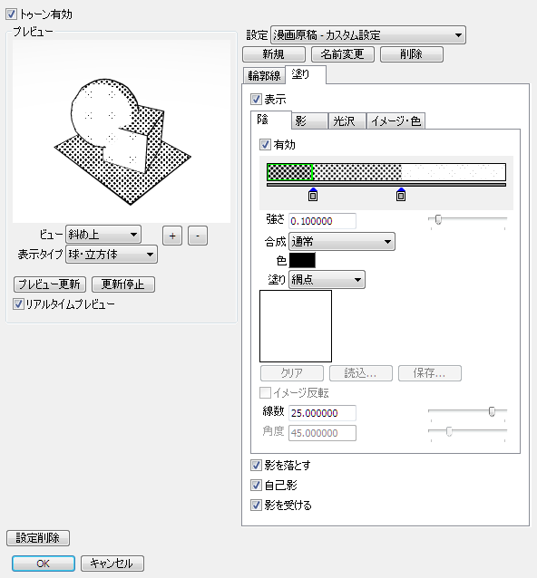 - 面を塗るときの 陰、影、光沢となる部分でのパターンを設定します。