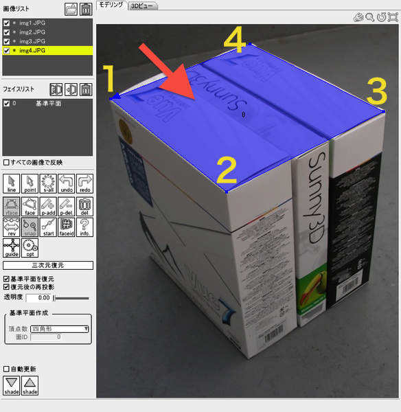 「基準平面」はすべての画像に存在する面で、現実世界での正方形、あるいは長方形である必要があります。フォトモデラーを起動すると「rface」ツールが選択されてます。このツールが選択された状態で、右のプレビューエリアで左回りに4点をクリックして基準平面を配置します。クリックする最初の位置は、すべての基準平面で同じ位置でなければなりません。ここでは上部の面を基準平面とし、最初のクリック位置は「Vue 7」の「7」の文字の上としました。