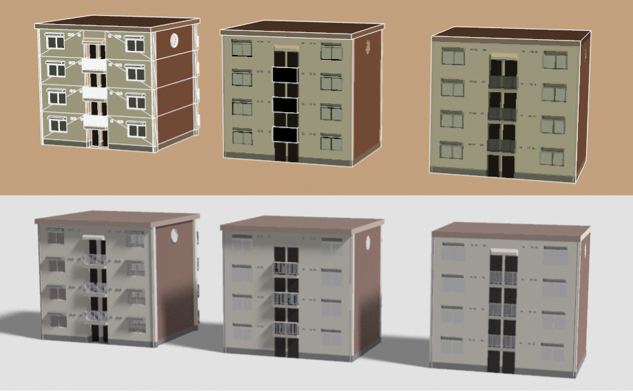 下の例では、本体と屋根、柵を分けることで建物の特徴を維持しつつ軽量化を行っています。