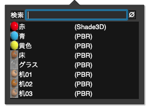 - 右からマスターサーフェスのサムネイル、名前、マテリアルの種類(PBR、Shade3D)を表示します。