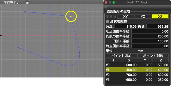 「道路線形」ツールパラメータが表示され、選択しているコントロールポイントがハイライト表示されます。