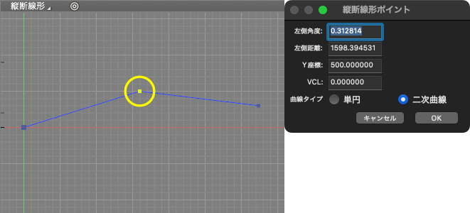- 「形状編集」モードでコントロールポイントを選択し「コントロールポイント編集」で「縦断線形ポイント」の詳細設定を行えます。