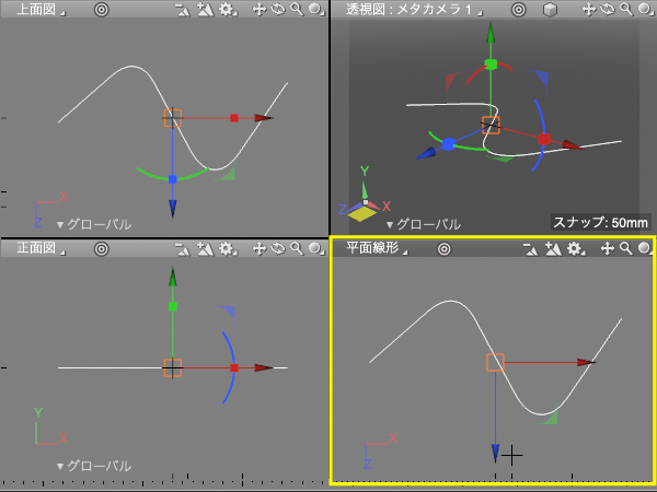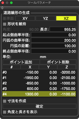 - 道路線形の初期の変形では、「XY」が正面図、「YZ」が右面図、「XZ」上面図がそのまま「平面線形」のポイントと同じになります。道路線形に回転などの変形がある場合には、変形に応じたローカル座標の三軸に従った「XY」、「YZ」、「XZ」の向きが指定されます