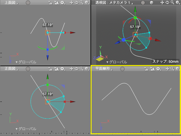 平面線形は透視図や上面図などの「3D図面」上で設定できる他、「平面線形」図面にて形状の回転、拡大縮小などの変形によらず平面線形を編集可能です。