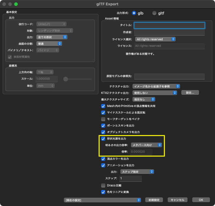 - オンのとき、glTF 上での明るさに「倍率」を乗じて入力します。