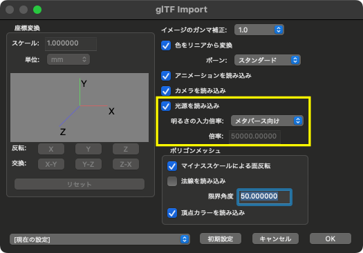 - 多くのメタバースシーンのビューイングに合わせて、glTF での明るさを 50,000倍にして入力します。