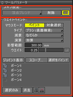 「ウエイトペイント」ツールを起動すると、ツールパラメータの表示が切り替わります。ここで、ウエイトペイントに関する設定の変更を行うことができます。