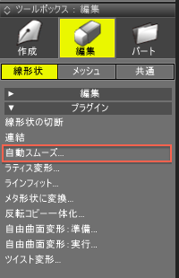 - 自動スムーズを適用する線形状または自由曲面パートを選択した状態で、ツールボックスの[編集]タブの[線形状]ボタンをクリックし、[プラグイン]グループから[自動スムーズ]を選択します。