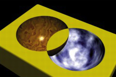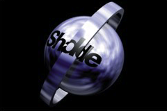 リングが取り巻いている球の表面近くをメッシュが囲んでいるところです。球にはステッカーマッピングが行われています。リングは、大小2個の球とそれを削り取る2個の“*”記号付きの掃引体で作成されています。メッシュは“*”記号の効果を受けて削り取られ、更に“=”記号の効果も受けます。中のイメージは、バックドロップを使用して、ワイヤフレームをレンダリングしたイメージを数回合成したものです。