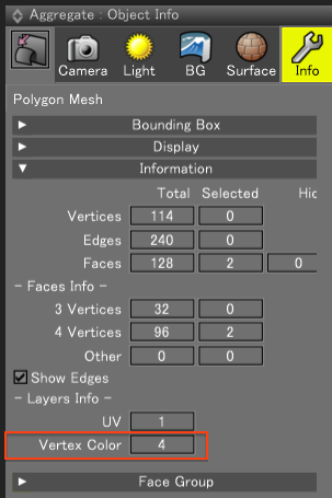 The number of vertex color layers is displayed under the Layers Info of the Object Info Window for polygon meshes.