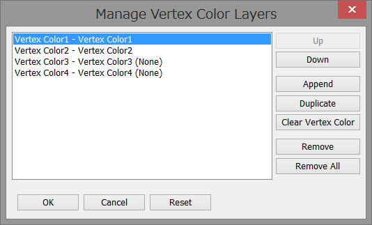 - Returns the Manage Vertex Color Layers dialog box to the state when it was opened.