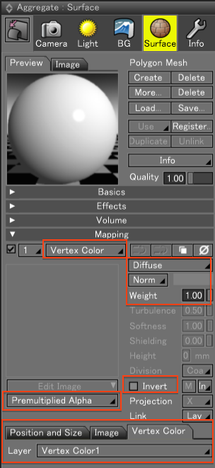 - When selected, surface attributes are created for the selected object and Vertex Color is assigned to the mapping settings.