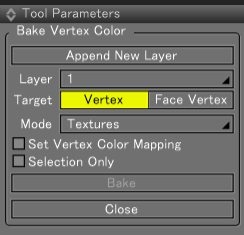 Select Vertex Color > Bake to open the Bake Vertex Color tool parameters. The combined texture mapping settings of the selected polygon mesh (the texture that is rendered), calculated normals, etc., can be baked on the mesh as vertex color.
