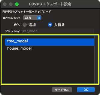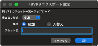 - F8VPSのアセット一覧へアップロードを行う「F8VPS エクスポート設定」ダイアログを表示します。