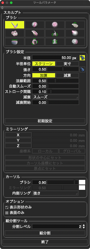 どの項目を選択しても「スカルプト」モデリングツールの使用状態となり、「スカルプト」ツールパラメータが表示されます。