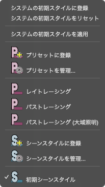 インターフェイス「イメージウインドウ」 > 「レンダリング設定」 > 「レンダリングスタイル」ポップアップメニュー