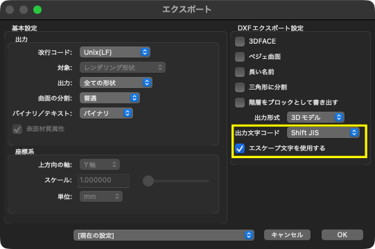 DXFエクスポートにおいて、特殊文字のエスケープ文字化を行うチェックボックスを追加しました。Shift JISに無い特殊文字を利用した場合の文字化けを回避できます。