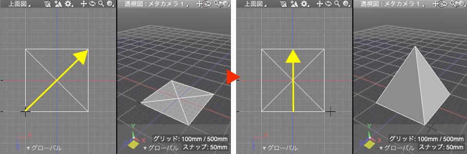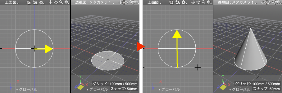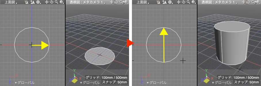 直方体や円柱などの高さをもつプリミティブ形状は、底面を作成した平面とは別の平面をドラッグして高さを指定していましたが、底面を作成した平面と同一の平面をドラッグしても高さを指定できるように変更しました。