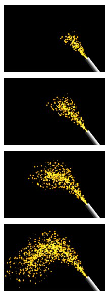 パーティクルの射出方向は、発生源として使用した形状の種類に応じて違っています。球では表面の法線方向(つまり全方向)に、円はパーティクル設定によって五通りの方向に、線形状ではその接線に垂直な平面上の全方向に、点光源では全方向に、スポットライトではスポットライトの照射角の範囲内に、それぞれパーティクルを射出します。
