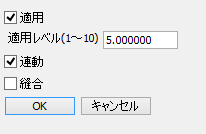 (左端は自動スムーズ適用前の形状。次から順に、[適用レベル]/1、5、10) - [連動]チェックボックス