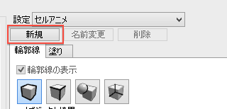- 「設定」ポップアップメニューの下にある「新規」ボタンをクリックします。「設定」ポップアップメニューの中に「セルアニメ - カスタム設定」というオリジナルの設定項目が追加されました。