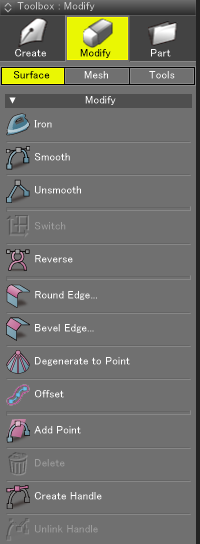 Surface 도구를 표시하려면 도구 상자의 Modify 탭을 클릭한 다음 Surface 버튼을 클릭하십시오.