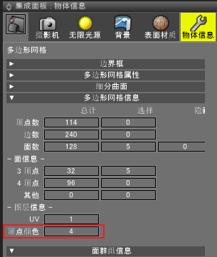 顶点颜色层的数量显示在多边形网格信息组的层信息中。。