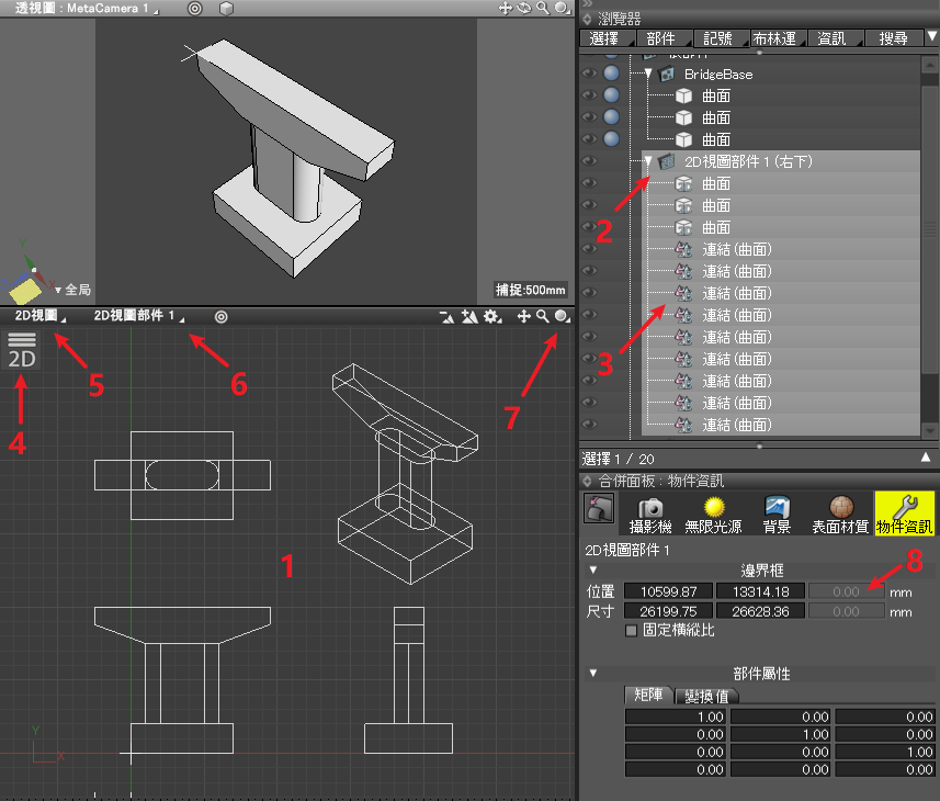 - 可從「工具」>「部件」>「2D視圖部件」創建。